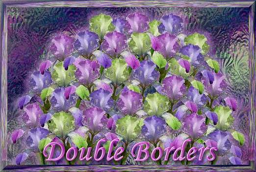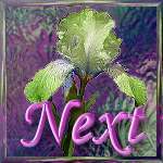 Here we are doing fancy double borders with a matching title graphic and buttons. I made the stained glass backgrounds on the title graphic and the buttons with Photo Impact - I tried to make it look like carnival glass, To make the main background I used the same stained glass but put it over a pale green background and brought the transparency to the point that it looked more green than carnival glass. The borders and divider I made from a photo of the blue iris that grows in my yard. I cut it out and made a gif and then I colorized two of them to the chartreuse and the pinkish color. I also used them in the main graphic and the buttons.